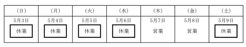 休業期間:2026年5月2日(土) ~5月6日(水)